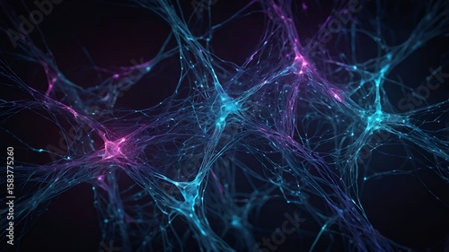 Abstract AI: glowing neural network of light nodes & energy streams. Dark gradient, electric blue to violet. Futuristic, high contrast.