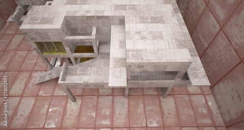 Abstract architectural concrete and rusted metal interior of a minimalist house with white background . 3D illustration and rendering.
