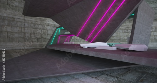 Abstract architectural concrete interior of a minimalist house with colored neon lighting. 3D illustration and rendering.