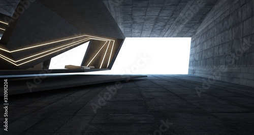 Abstract architectural concrete interior of a minimalist house with swimming pool and neon lighting. 3D illustration and rendering.