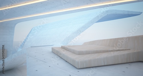 Abstract architectural concrete, wood and glass interior of a modern villa on the sea with swimming pool and neon lighting. 3D illustration and rendering.