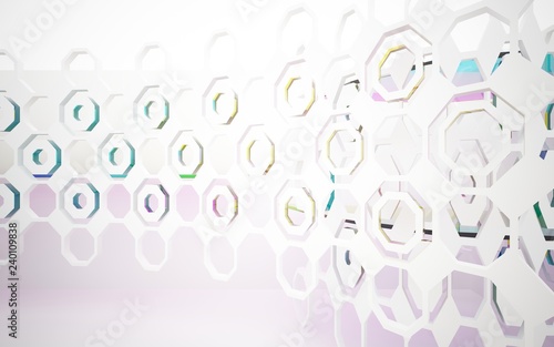 abstract architectural interior with white sculpture and geometric gradient glass box. 3D illustration and rendering