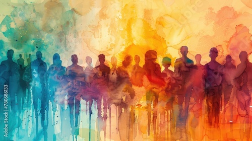 Abstract art watercolor painting showing a diverse group of people coming together.