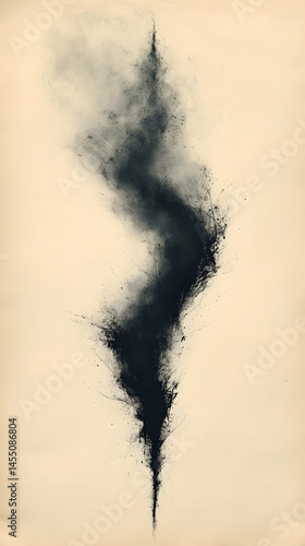 Abstract artwork depicting a dark, smoky, vertical form resembling an elongated, twisting plume against a pale background