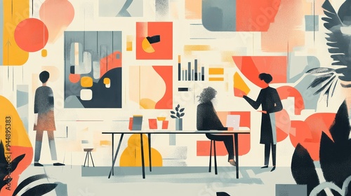 Abstract Artwork Displayed in a Modern Office Setting with Three People