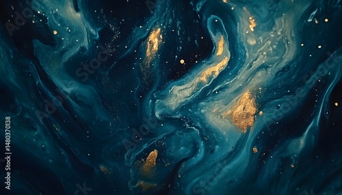 Abstract artwork of swirling deep blues and golds.