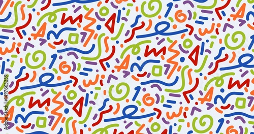 Abstract background featuring a vibrant Memphis-style pattern with colorful geometric doodles. Perfect for wallpapers, packaging, textiles, and creative design projects.