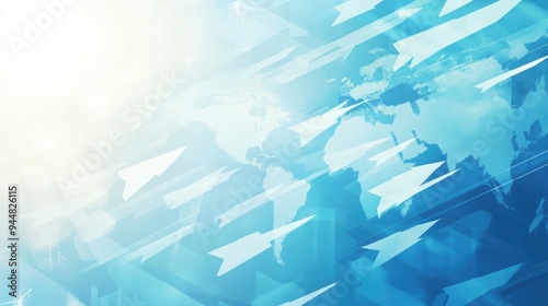 Abstract background featuring white arrows against a blue backdrop complemented by a world map design