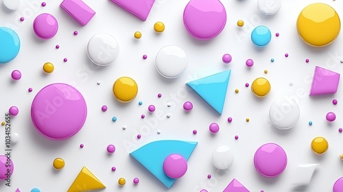 Abstract background of colorful geometric shapes and small dots on white surface.