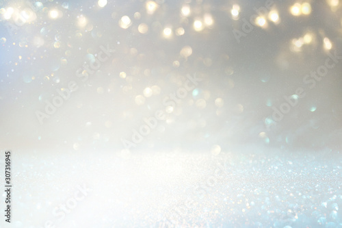 abstract background of glitter vintage lights . silver, gold and white. de-focused