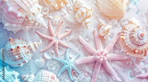 Abstract background of pastel colored starfish and seashells. Beautiful background
