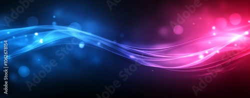 Abstract background with a blue and pink gradient, light rays, and wave lines.