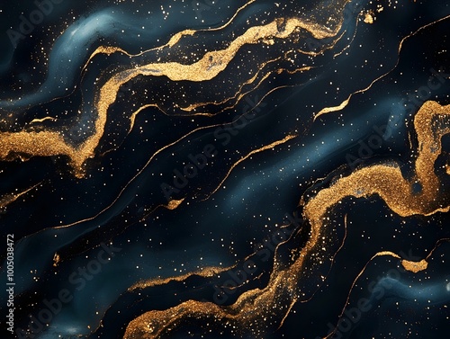 Abstract background with a dark navy blue and black base with a golden glitter texture. Swirling lines flow across the surface creating an elegant look.