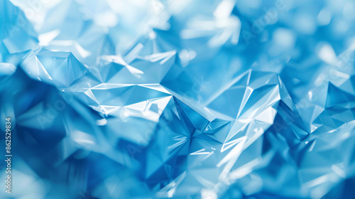 Abstract background with blue low poly shapes, crystal texture and grainy particles on the surface. High resolution.