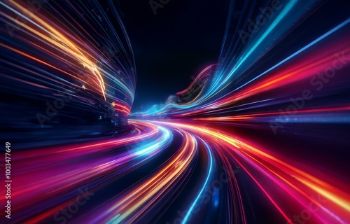 Abstract background with bright, glowing light streaks curving through the frame in vibrant colors.