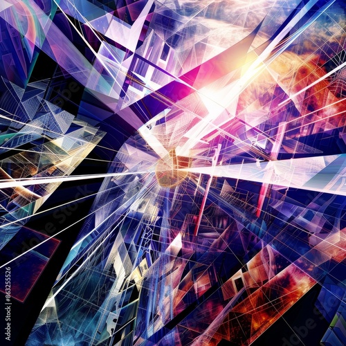 Abstract background with colorful geometric shapes and a bright light source. The colors create a dynamic and energetic composition.
