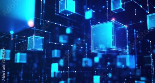 Abstract background with cubes and blocks on a blue neon light, glowing in the dark space