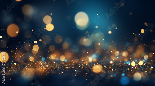 abstract background with Dark blue and gold particle. Christmas Golden light shine particles bokeh on navy blue background. Gold foil texture. Holiday concept