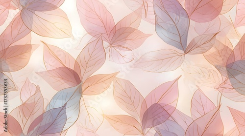 Abstract background with transparent pastel leaves. Elegant and gentle nature pattern.