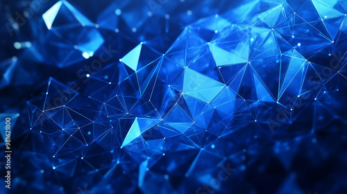 Abstract background with triangle cells and neon light for design. Bright blue digital illustration with polygons on a black background.