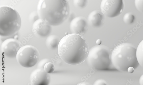 Abstract background with white spheres floating in the air on a light grey backdrop. Minimalist and modern design. Different sized spheres. Elegant atmosphere.