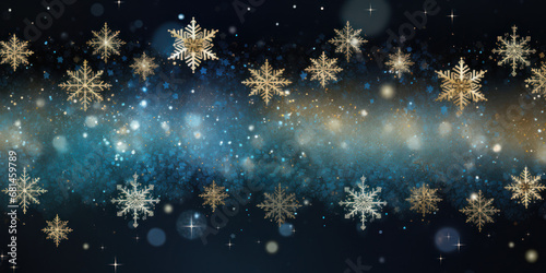 Abstract banner winter background with glowing gold snowflakes and bokeh on a blue backdrop.For greeting card o web page design. Christmas or New Year event organizing agency