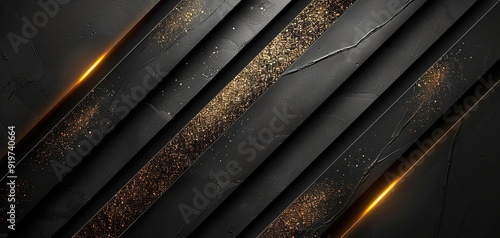 Abstract black and gold background with diagonal stripes and gold glitter.
