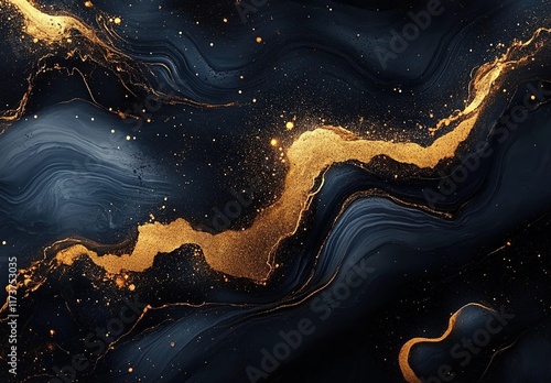 Abstract black and gold marble background with golden veins, fluid shapes, and liquid splashes.
