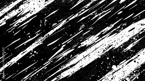 Abstract black and white diagonal brushstrokes with splattered paint on a dark background.