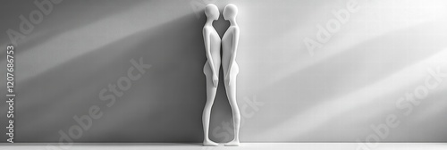 Abstract black and white figures embracing in a minimalist setting with soft lighting