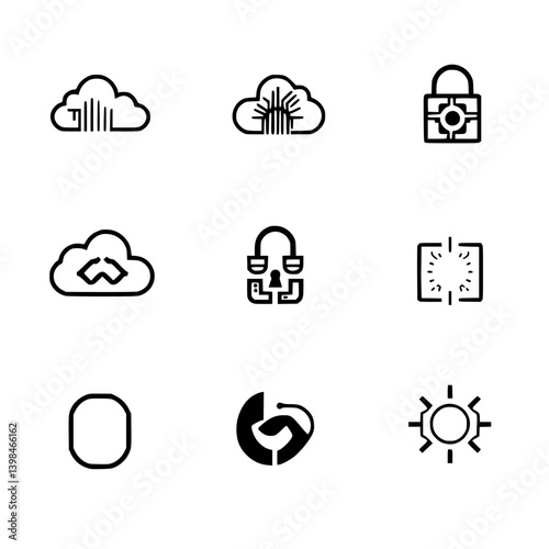 Abstract Black and White Icon Set - Cloud, Padlock, Sun, and Circular Designs for Creative Projects