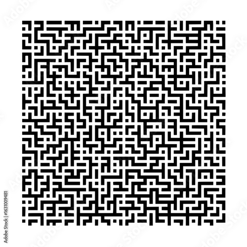Abstract black and white maze pattern design featuring intricate geometric shapes and complex lines layout
