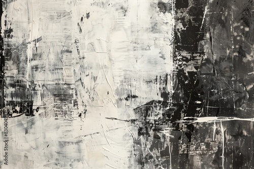 Abstract black and white painting with textured strokes.