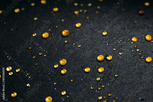 Abstract black background with golden glitter dots. Caramel on frying pan