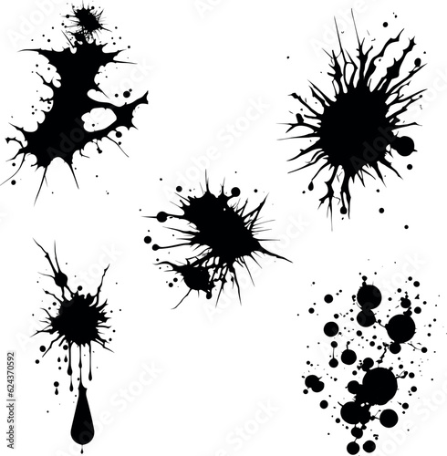 Abstract black ink splashes collection. Ink drops and splashes. Blotter spots, liquid paint drip drop splash, and ink splatter. Artistic dirty grunge abstract spot vector set. Splat messy inkblot