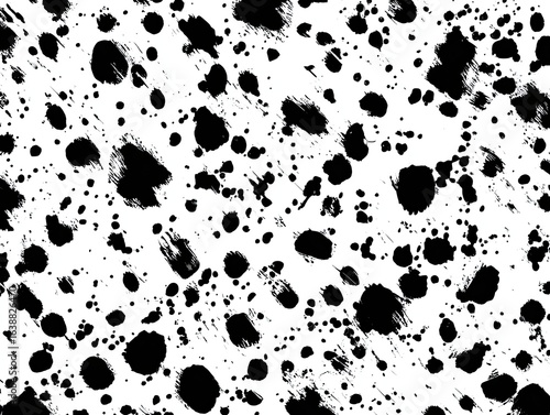 Abstract black ink splatters and brushstrokes on a white background. A repeating pattern of random, irregular shapes