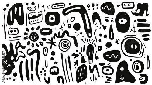 Abstract black magic marker doodles on paper, fun and whimsical, flat scan, white background