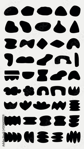 Abstract black shapes on a white background. Various geometric forms, abstract shapes, and artistic patterns. Creative abstract design with black shapes. Black and white vector set.