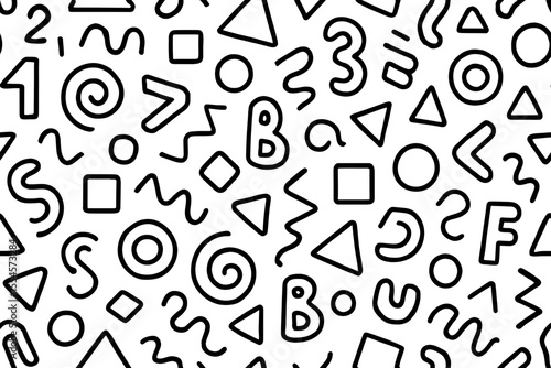 Abstract Black White Doodle Pattern Seamless Background Design with Geometric Shapes Numbers Letters Spirals Squiggles and Lines Simple Hand Drawn Texture