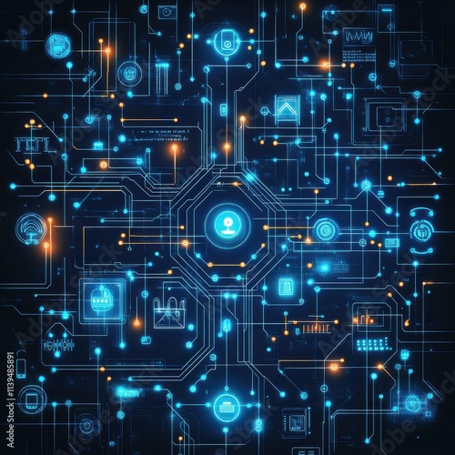 Abstract blue and orange digital technology circuit board background with glowing connections and data icons.