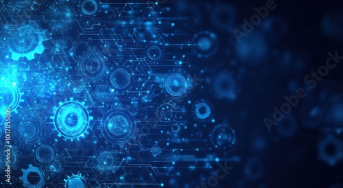 Abstract blue background with interconnected digital gears and arrows, depicting technology and innovation concepts in a futuristic cyber environment