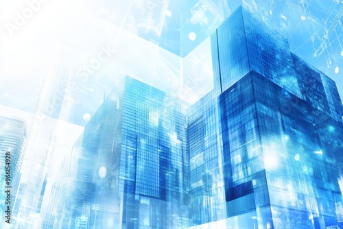 Abstract blue city skyline with glass buildings, bright sky, and lens flare.