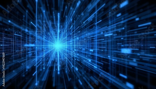 Abstract blue digital grid lines with perspective, creating a futuristic and technological background, with a sense of depth and complexity