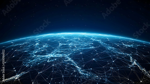 Abstract Blue Digital Planet Illuminated With Network Connections In Dark Space
