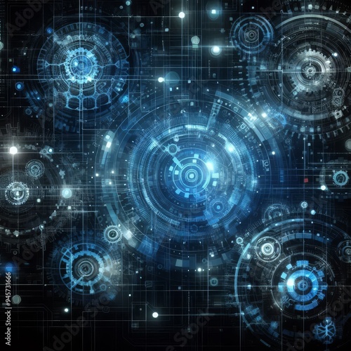 Abstract blue digital technology background with gears and cogs, dark color palette