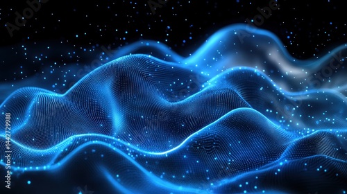 Abstract blue digital waves, dark background, glowing particles, tech concept