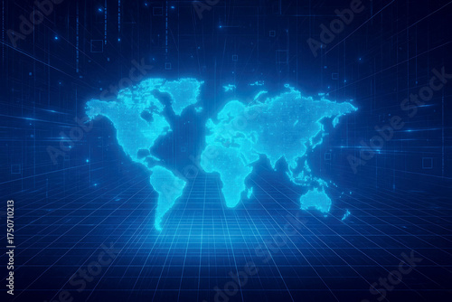 Abstract Blue Digital World Map with Data Streams and Grid global technology