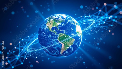 Abstract blue light wave surrounding the globe. Internet and telecommunication creating seamless modern infrastructure