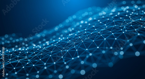 Abstract blue network with connected dots and lines creating a wavy surface in a dark background