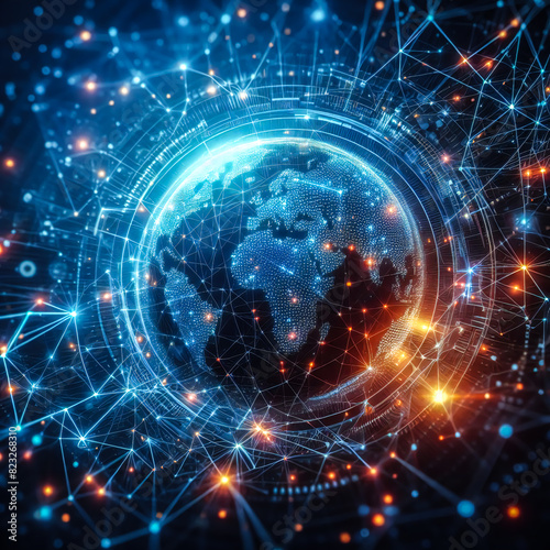 Abstract blue technology background with a cyber network grid and connected particles blue light and orange light. Artificial neurons, global data connections robot - Generative AI